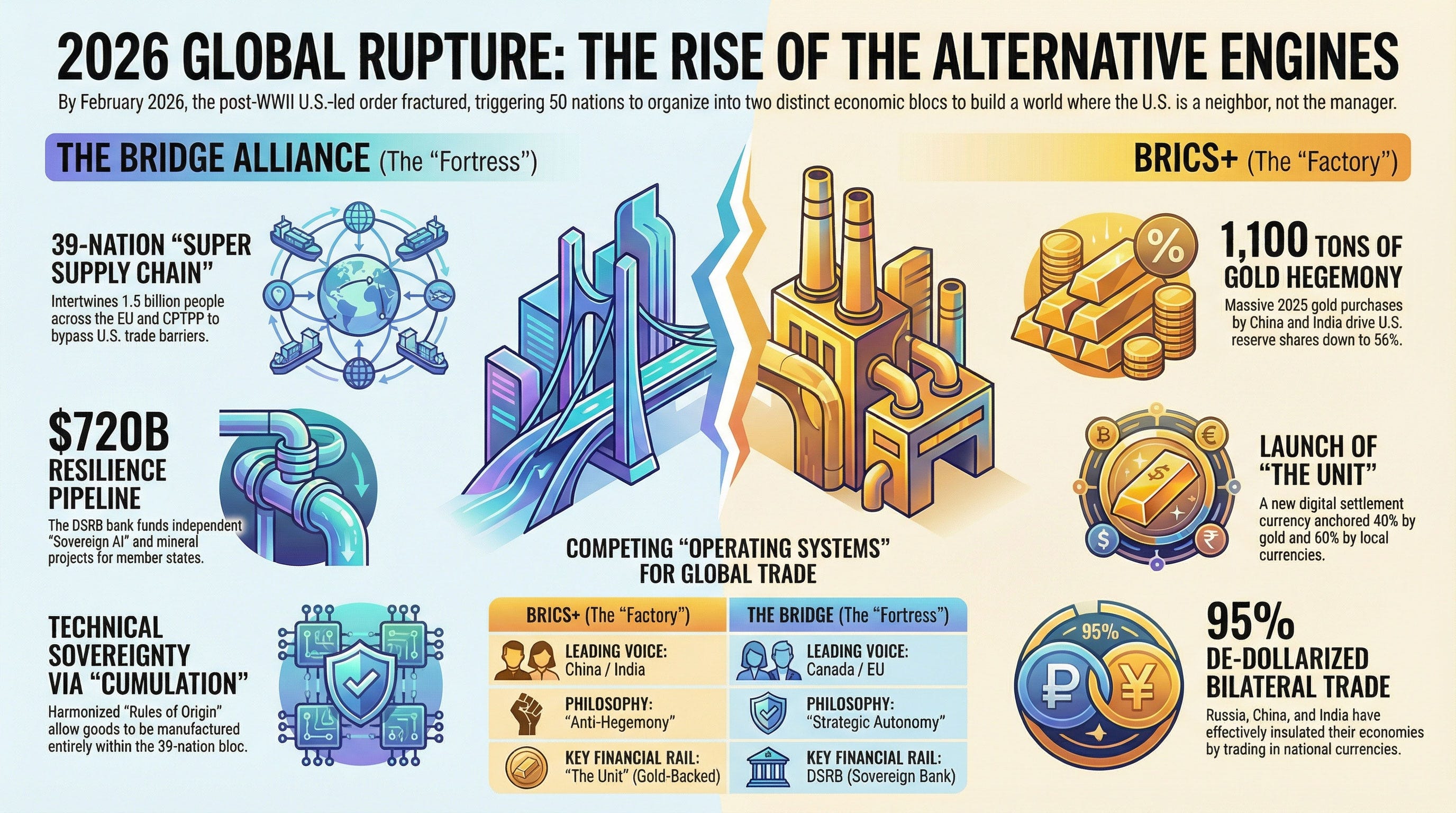 While the Bridge Alliance builds its “Fortress,” BRICS+ has established itself as the global “Factory.” As of February 2026, the bloc has de-dollarized 90-95% of trade between Russia, China, and India. Their primary tool is “The Unit,” a digital settlement rail backed 40% by gold and 60% by a basket of local currencies.