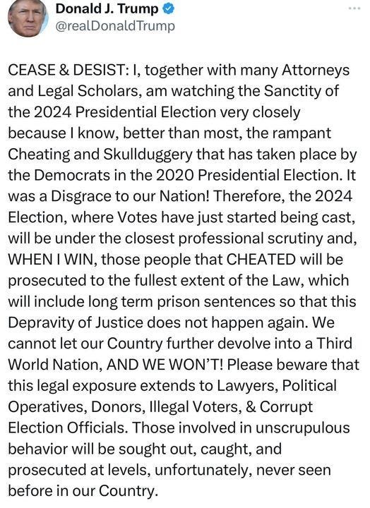 This post raises concerns among political analysts and observers about the potential for post-election disputes and challenges to the democratic process. The implication that opposing results will lead to criminal prosecution, including targeting lawyers, voters, and officials, suggests a broader legal strategy aimed at deterring opposition and controlling the narrative around the election’s legitimacy.